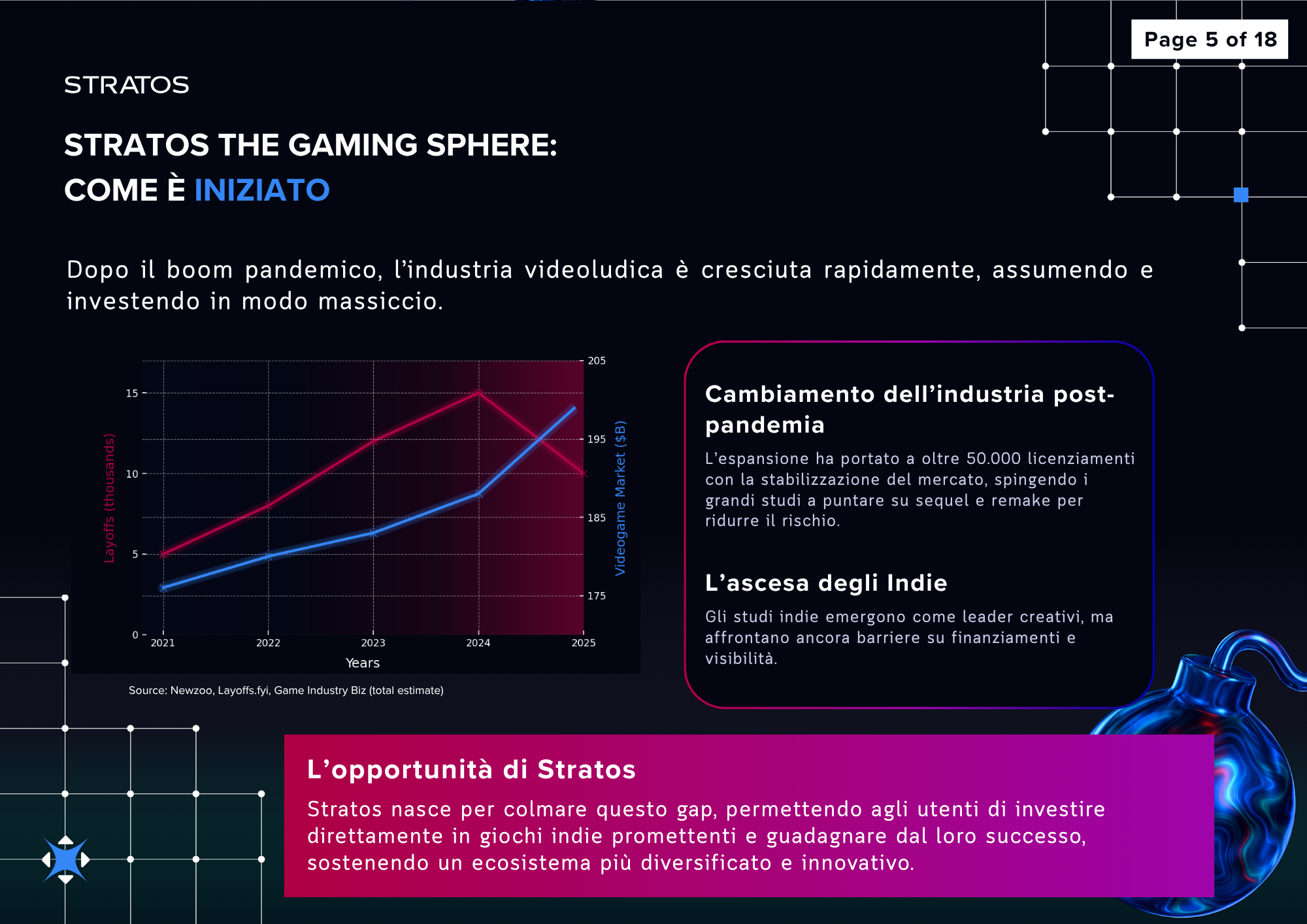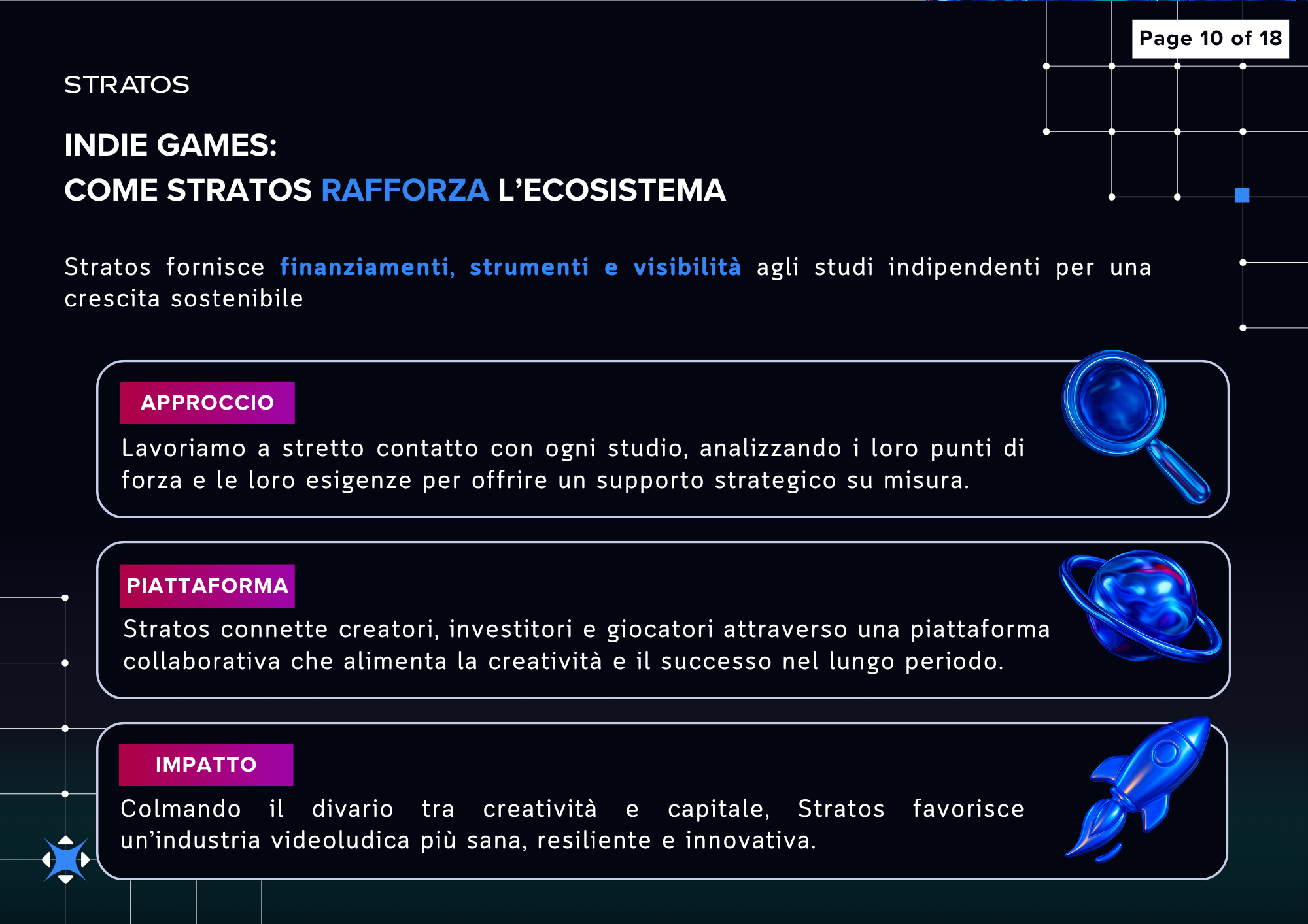 L’operazione di crowdfunding “Piattaforma di Videogiochi con AI” finanzia la nuova fase di sviluppo di Stratos (Brand commerciale di Tied Company), una startup innovativa che utilizza intelligenza artificiale, analisi predittiva e servizi di advisory per selezionare e supportare videogiochi indipendenti ad alto potenziale.