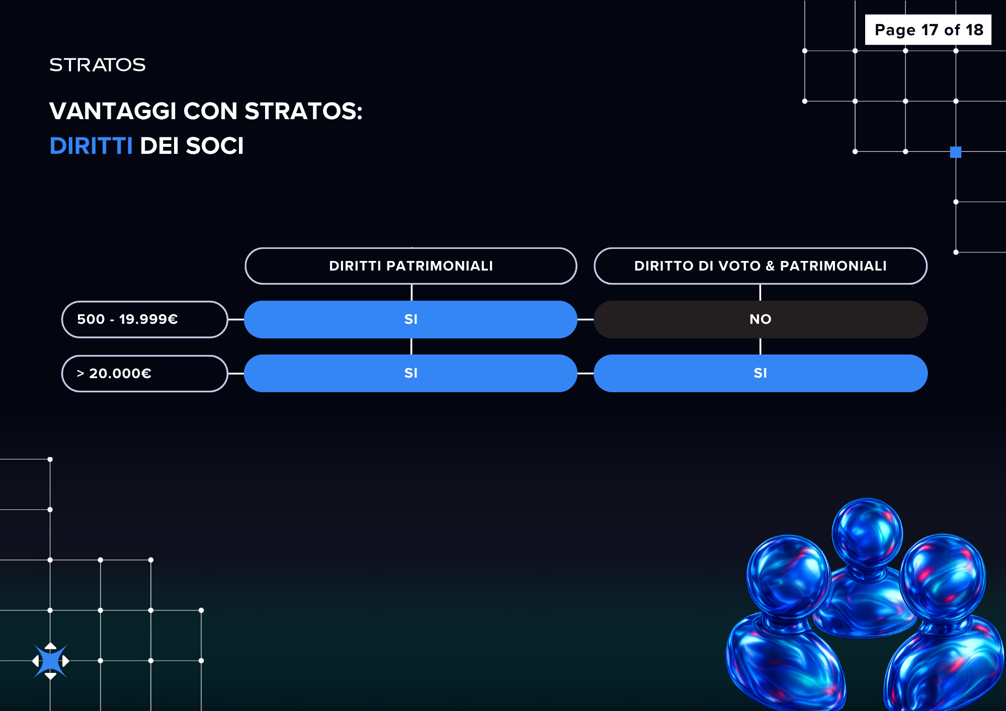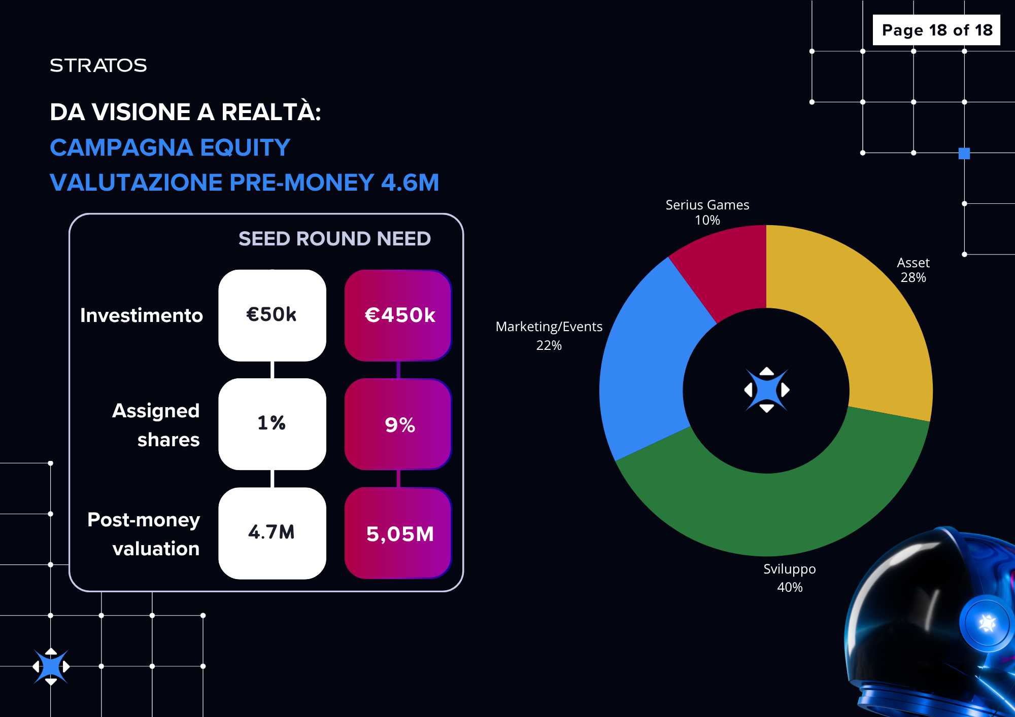 La società è stata oggetto di una valutazione da parte di un soggetto professionale esterno qualificato, che ha stimato per Stratos una valorizzazione pre-money di circa € 4,6 milioni.